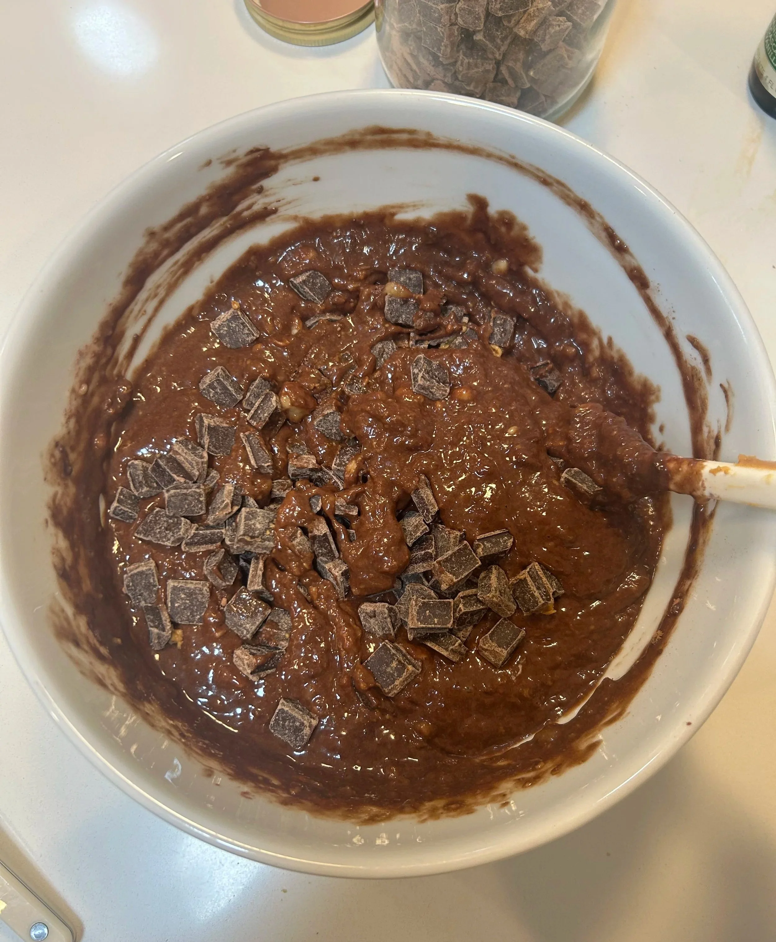 - Add the chocolate chips to the batter and mix until they are evenly distributed.