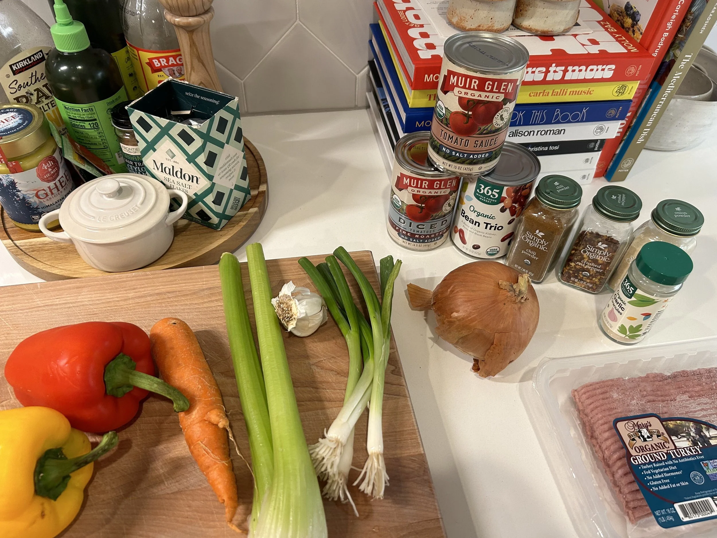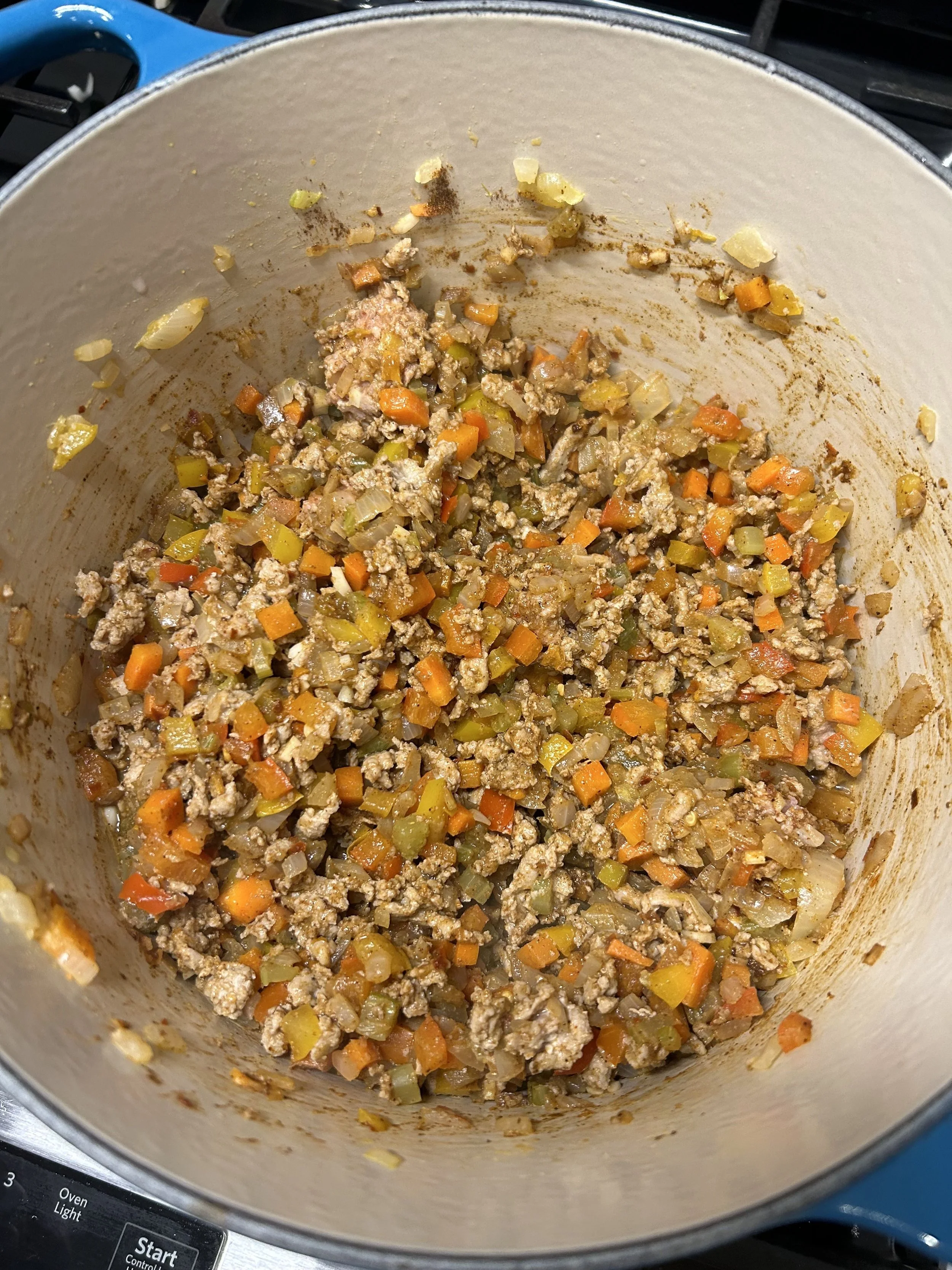 - Meanwhile, slice your garlic and scallions and set aside. Add ground turkey to the pot, browning the meat over medium heat with the vegetables. Add the garlic to the pot along with all of the dried spices (red chili flakes, onion powder, garlic powder, chili powder) and toast them with the meat and vegetables for two minutes.